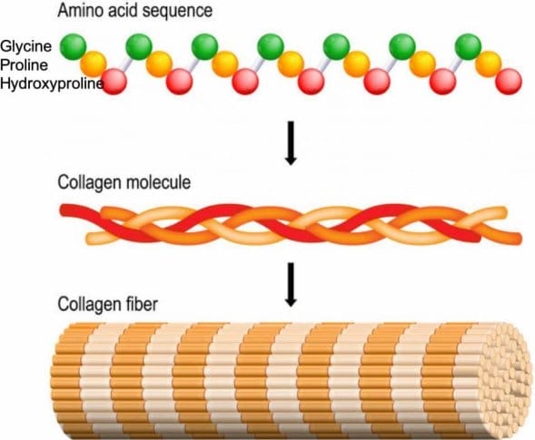 Ci sono almeno 29 tipi di collagene nel corpo umano, ma il 90% è collagene di tipo I. Tutte le tipologie di collagene sono formate da 19 aminoacidi, ma c’è una prevalenza di 3 aminoacidi: glicina, prolina e idrossiprolina.